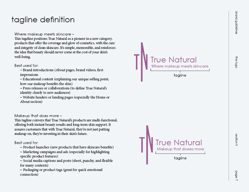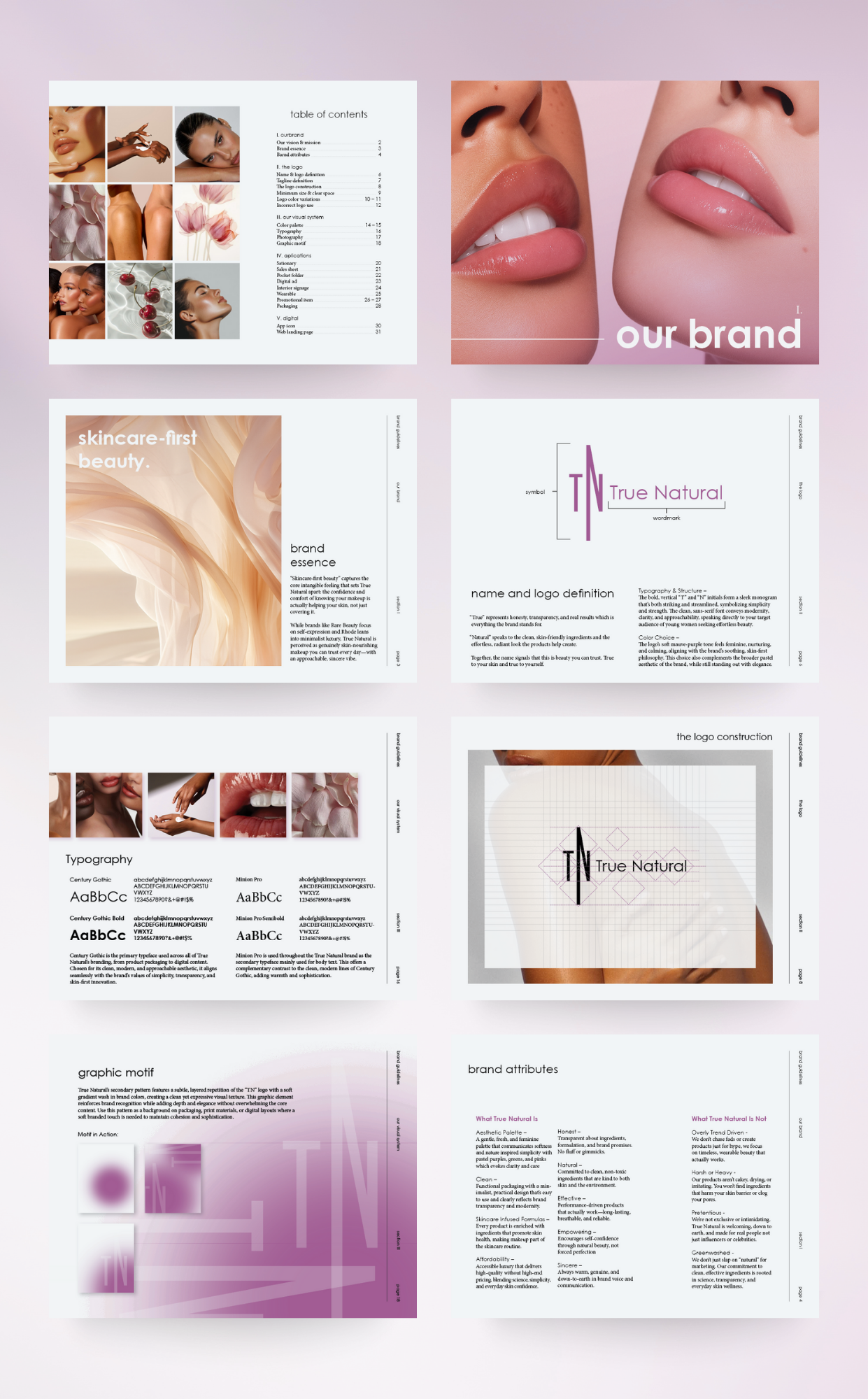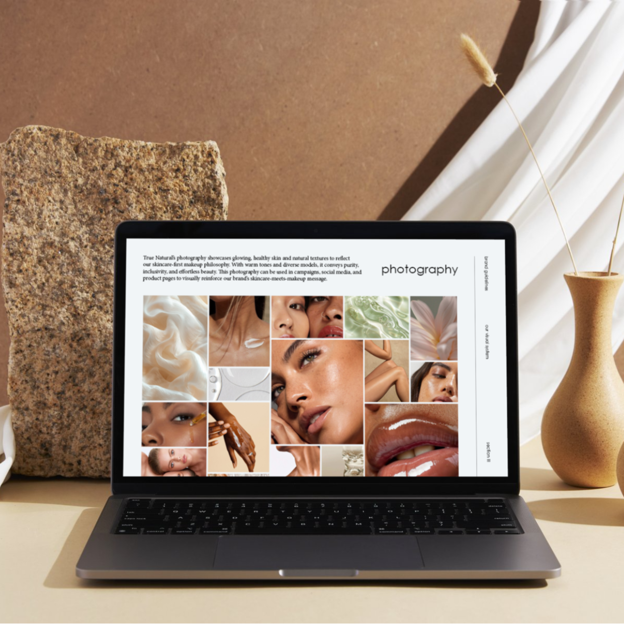 Redesigned and rebranded True Natural to align with its updated mission of skincare-infused makeup for everyday wear, with a focus on creating clear, cohesive brand guidelines. I developed a new logo, color palette, and typography system that reflects the brand’s fresh, feminine, and skin-conscious identity, and translated these elements into guidelines that ensure consistency across packaging, digital platforms, and marketing materials.
